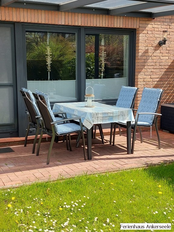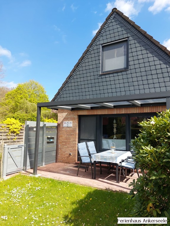 die gepflasterte Terrasse mit Überdachung, Gartenmöbel, Sonnenschirm und Kugelgrill.