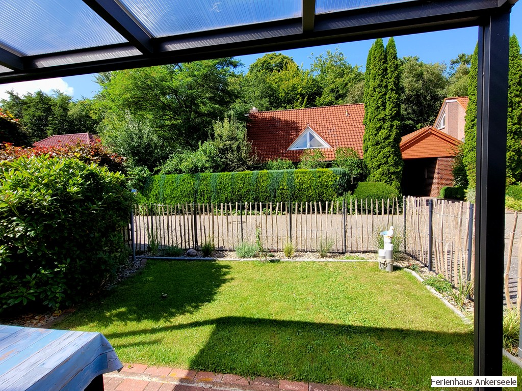 die gepflasterte Terrasse mit Überdachung, Gartenmöbel, Sonnenschirm und Kugelgrill.